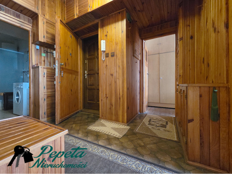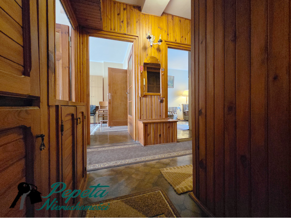 – w korytarzu na podłodze wykładzina PCV, na ścianach boazeria drewniana,