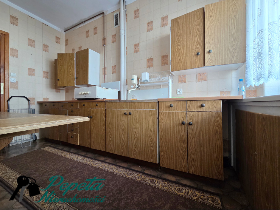 – w kuchni na podłodze wykładzina PCV, ściany w tapetach,